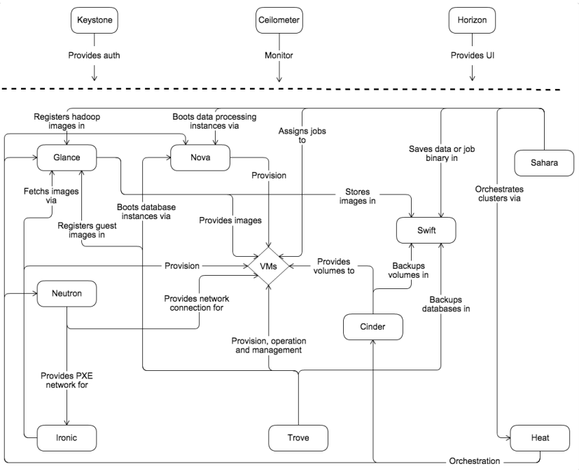 As shown in Conceptual architecture, OpenStack consists of several independent parts, named the OpenStack services. All services authenticate through a common Identity service. Individual services interact with each other through public APIs, except where privileged administrator commands are necessary.