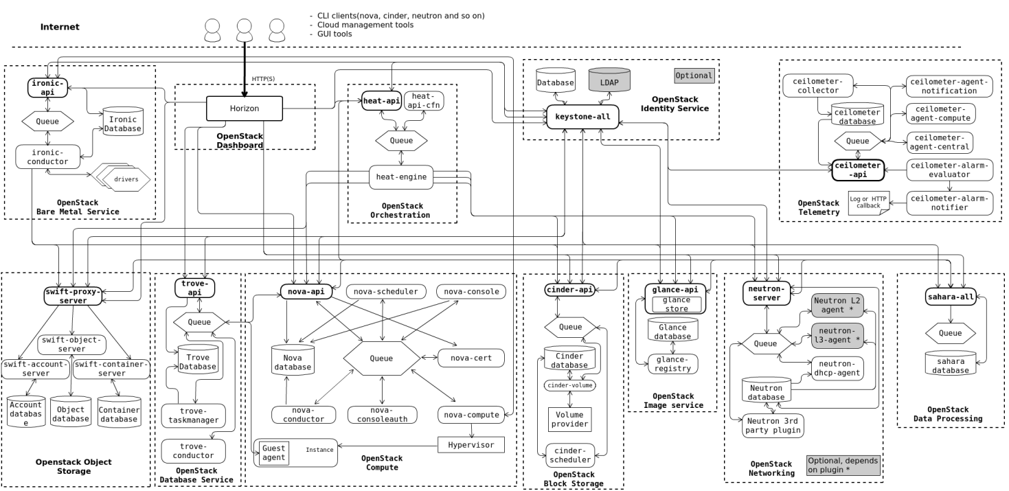 The following diagram shows the relationships among the OpenStack services: