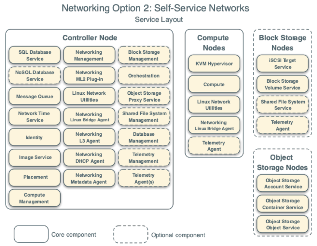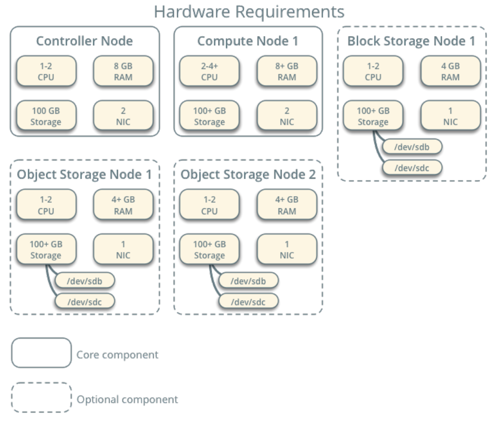 The example architecture requires at least two nodes (hosts) to launch a basic virtual machine or instance. Optional services such as Block Storage and Object Storage require additional nodes.