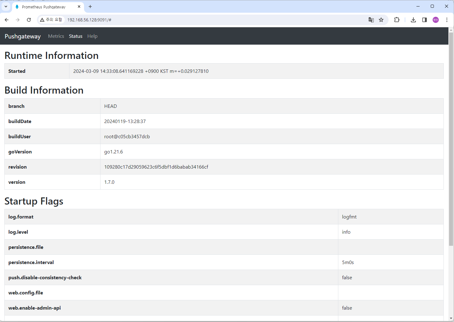 Mar 09 14:33:08 servidor pushgateway[2134]: ts=2024-03-09T05:33:08.625Z caller=main.go:86 level=info msg="starting pushgateway" version="(version=1.7.0, branch=HEAD, revision=109280c17d29059623c6f5dbf1d6babab34166cf)"