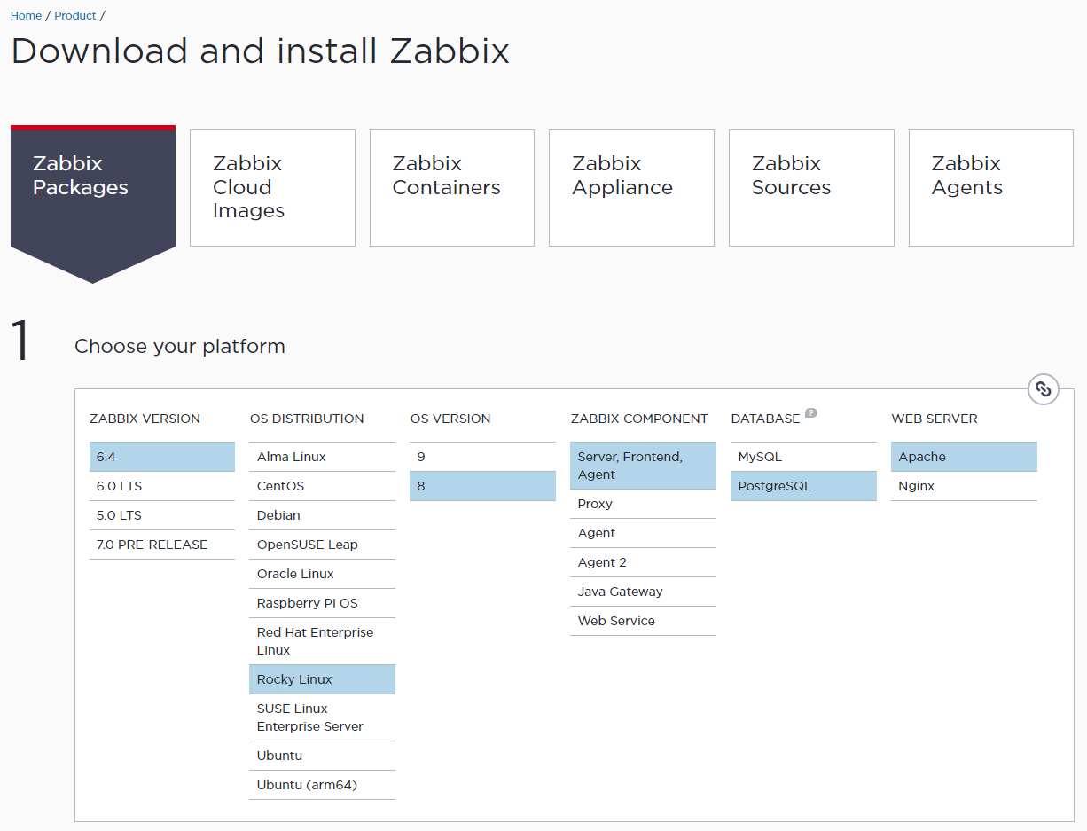 - Zabbix 설치하고픈 환경 선택 (Zabbix 6.4, Rocky Linux 8, Server, Agent, PostgreSQL, Apache)를 선택함