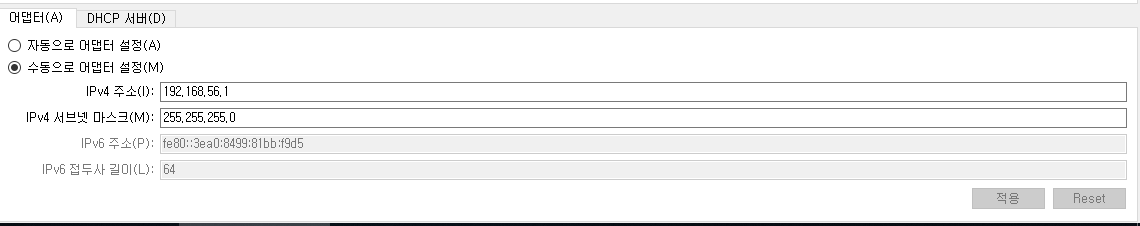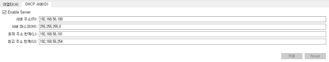 # 가상화 서버 IP 대역을 192.168.56.X 대역으로 설정 (DHCP 또는 서버에서 수동 할당 가능)