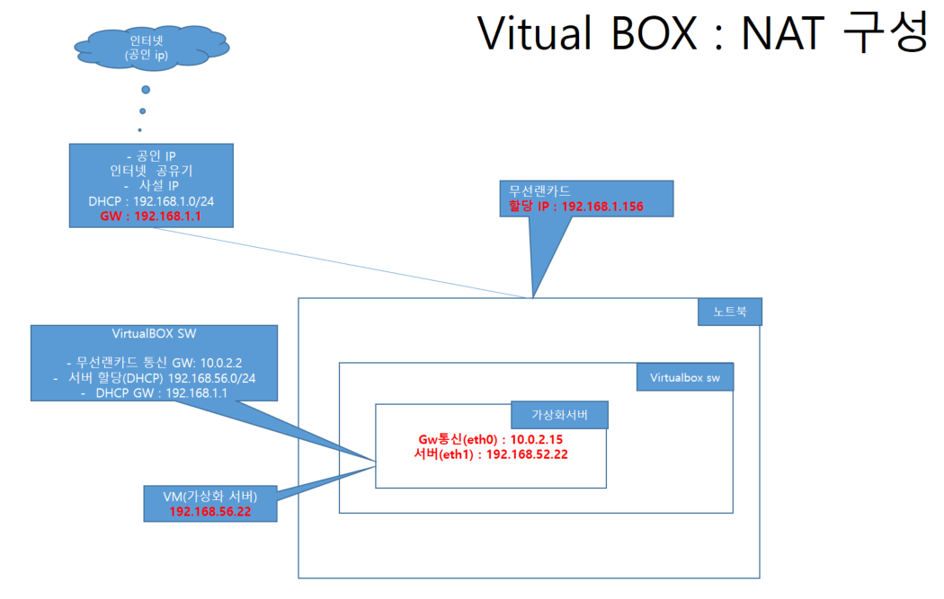 - 192.168.56.22(eth1)에서 --> 10.0.2.15(eth0) ---> 10.0.2.2(gw) ---> 192.168.1.156 (노트북 ip) ---> 192.168.1.1(공유기 gw) ---> 공유기 외부 인터페이스(공인ip)로 통신 함