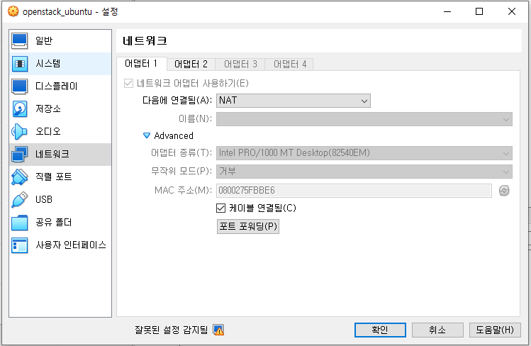 - 어댑터 1 : NAT< NAT 모드 어댑터 1 설정>