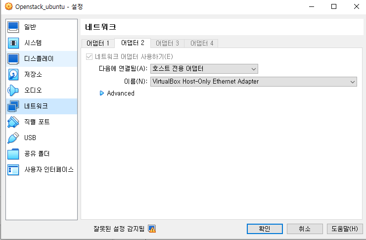 - 어댑터 2 : 호스트 전용 어댑터< NAT 모드 어댑터 2 설정 >