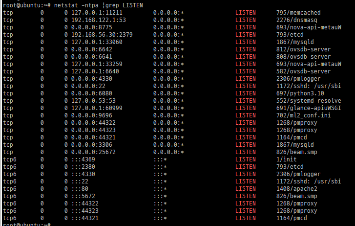 # service --status-all [ - ] apache-htcacheclean [ + ] apache2 [ + ] apparmor [ + ] apport [ + ] binfmt-support [ - ] console-setup.sh [ + ] cron [ - ] cryptdisks [ - ] cryptdisks-early [ + ] dbus [ - ] grub-common [ + ] guestfs-firstboot [ + ] haproxy [ - ] hwclock.sh [ + ] irqbalance [ + ] iscsid [ - ] keyboard-setup.sh [ + ] kmod [ - ] lvm2 [ - ] lvm2-lvmpolld [ + ] memcached [ + ] mysql [ - ] open-iscsi [ - ] open-vm-tools [ + ] openvswitch-switch [ + ] pcp [ + ] plymouth [ + ] plymouth-log [ + ] pmcd [ + ] pmie [ + ] pmlogger [ + ] pmproxy [ + ] postgresql [ + ] procps [ + ] rabbitmq-server [ - ] rsync [ + ] rtslib-fb-targetctl [ - ] screen-cleanup [ + ] ssh [ + ] sysfsutils [ + ] udev [ - ] ufw [ + ] unattended-upgrades [ + ] uuidd [ + ] uwsgi [ - ] x11-common