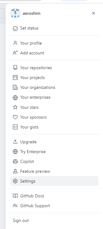 # GitHub 사이트 오른쪽 계정을 클릭하여 아래 Settings을 클릭합니다.