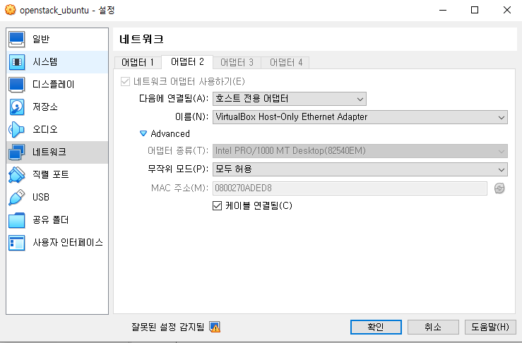 - 어댑터 2 : 호스트 전용 어댑터< NAT 모드 어댑터 2 설정 >
