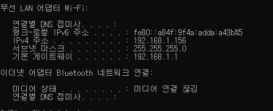 # 192.168.1.156 : 내 pc가 집/까페에서 할당받은 ip입니다.(무선(유선)랜이기 때문 무선(유선)랜카드 할당 내역)